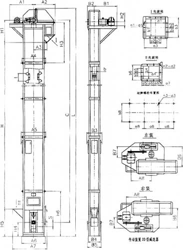 TH型斗提機(jī)外形見圖2,其尺寸見表7、驅(qū)動(dòng)裝置配套及相關(guān)尺寸見表9。