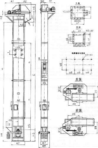 (1)傳動(dòng)裝置 TD型斗提機(jī)的傳動(dòng)裝置有兩種形式,分別配有YZ型減速型或ZQ(YY)型減速器。YZ型軸裝減速器直接套裝在主軸軸頭上,省去了傳動(dòng)平臺(tái)、聯(lián)軸器等,使結(jié)構(gòu)緊湊,重量輕,而且其內(nèi)部帶有異型輥逆止器,逆止可靠。該減速器噪聲低,運(yùn)轉(zhuǎn)平穩(wěn),并隨主軸浮動(dòng),可消除安裝應(yīng)力。(2)TD型斗提機(jī)備有四種料斗:Q型(淺斗)、H型(弧底斗)、Zd型(中深斗)、Sd型(深斗)